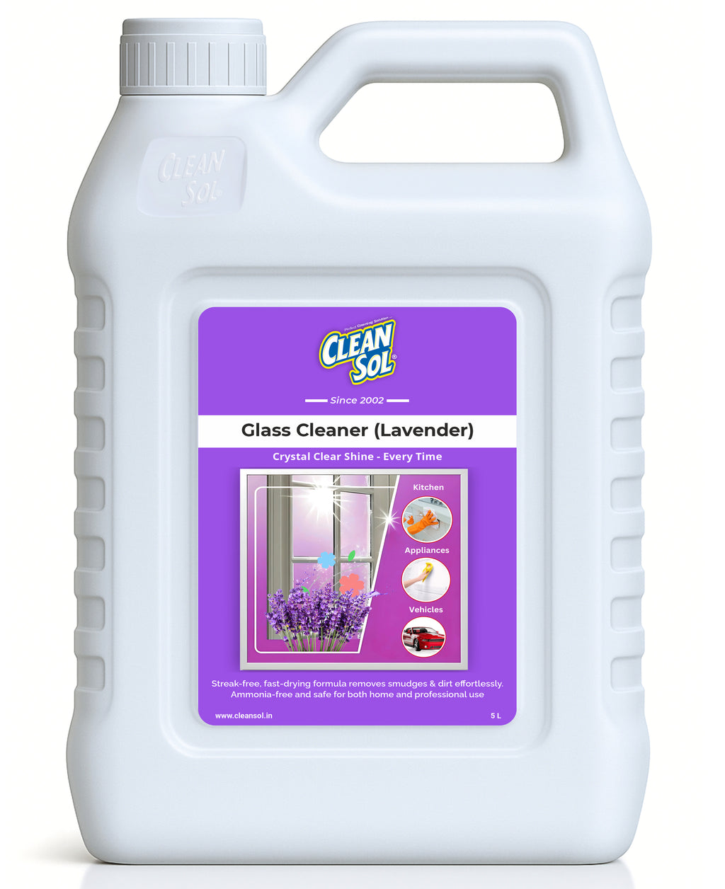 Cleansol Glass Cleaner Spray – Lavender Fragrance | Streak-Free, Non-Toxic, Ammonia-Free, Eco-Friendly Multi-Surface Cleaner for Windows, Mirrors, Car Windshields, Kitchen & Home Cleaning - 5 ltr