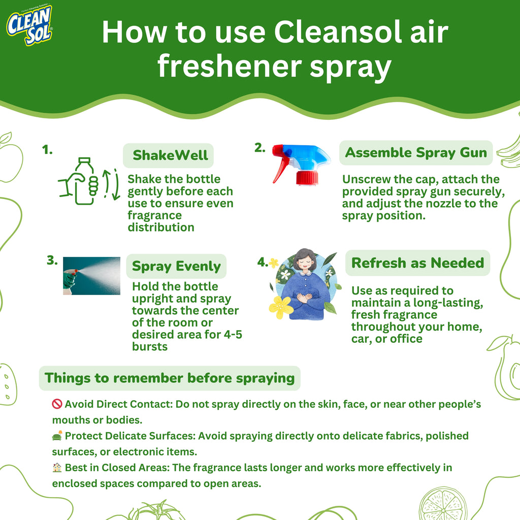 Shake well before use. Spray evenly into the air or onto fabric surfaces from a distance. Avoid direct spraying on polished or painted surfaces.