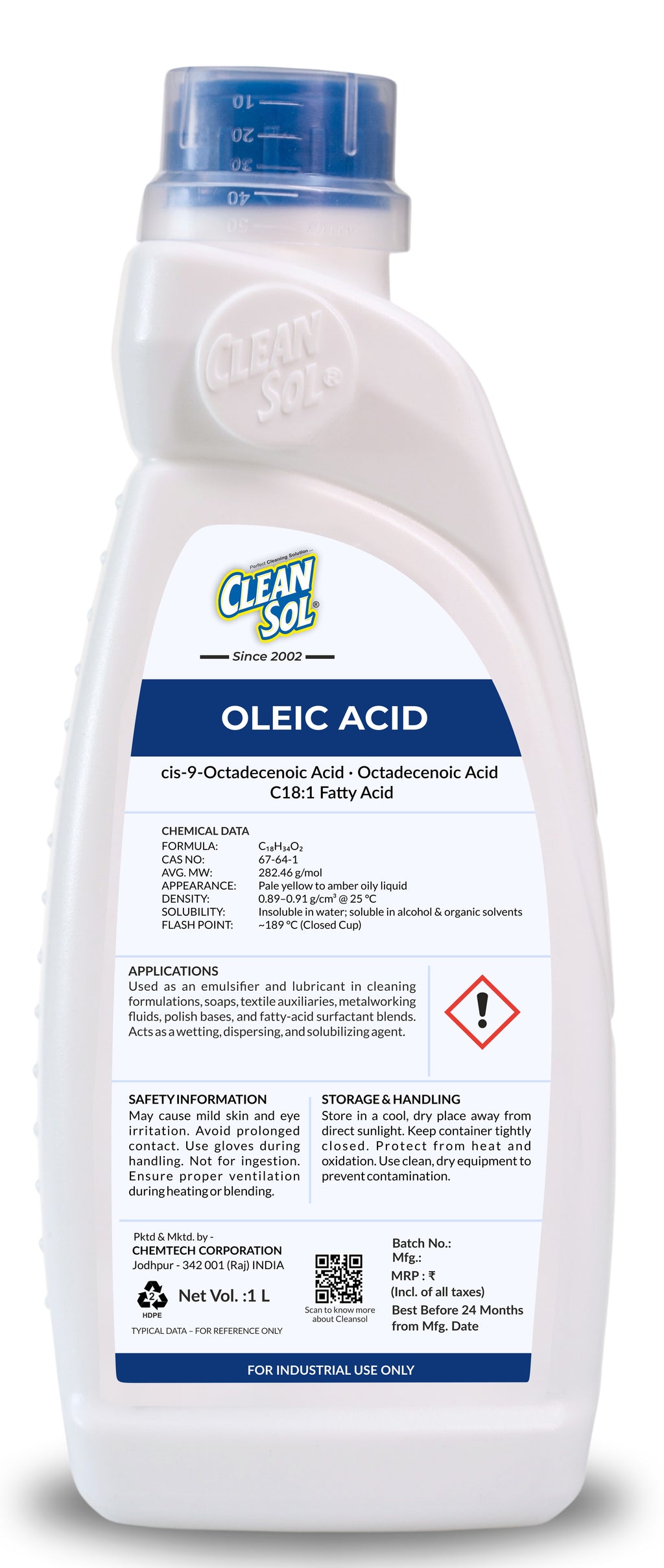 It is also useful in home care blends, liquid soaps and general-purpose formulations where a stable fatty acid component is required. Suitable for small creators, professional formulators and manufacturers, subject to proper handling and regulatory practices.